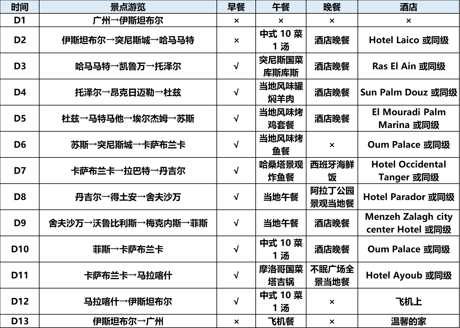 ★舌尖风味盛宴:特别安排四顿中式升级餐(10 菜 1 汤),囊括摩洛哥国菜塔吉锅、突尼斯国菜库斯库斯、大西洋海鲜餐、哈桑塔景观酥鱼餐等,地道风味一网打尽。
